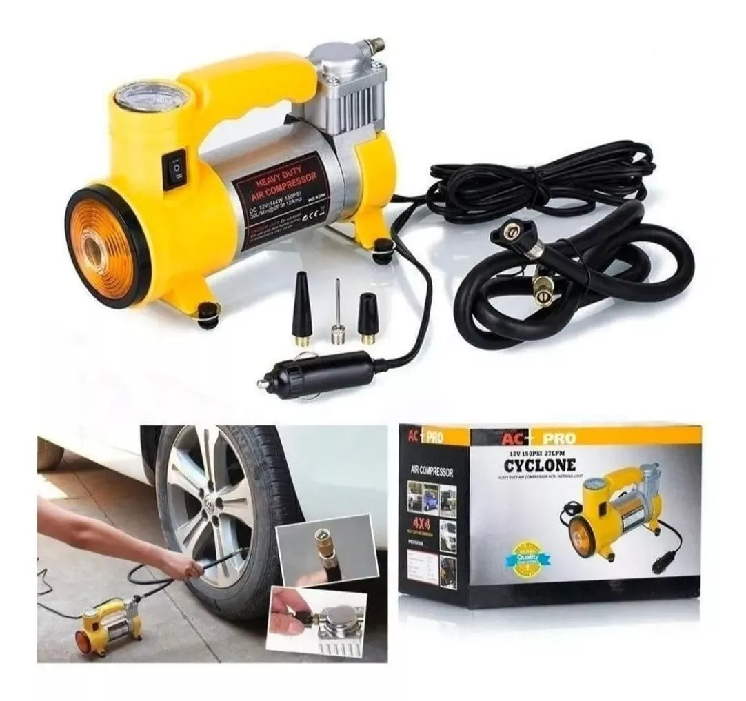 El Compresor Inflador De Aire Llanta Carro Vehículo Automático en color Amarillo es la herramienta perfecta para mantener tus neumáticos siempre en óptimas condiciones. Con un caudal de aire de 35 l/min y una presión máxima de 150 psi, podrás inflar tus llantas de forma rápida y eficiente. Su marca AC-PRO garantiza calidad y durabilidad en cada uso. Además, su diseño mini y portátil te permite llevarlo a cualquier lugar sin complicaciones. Incluso cuenta con una linterna incorporada para brindarte mayor visibilidad en situaciones de poca luz. No pierdas la oportunidad de adquirir este modelo Cyclone air150, alimentado por electricidad, y asegúrate de tener siempre un compresor confiable a tu disposición.GARANTIA1 mes por funcionamiento10 días por producto roto10 días por orden incompleta10 días si el producto que llega es diferente al solicitado