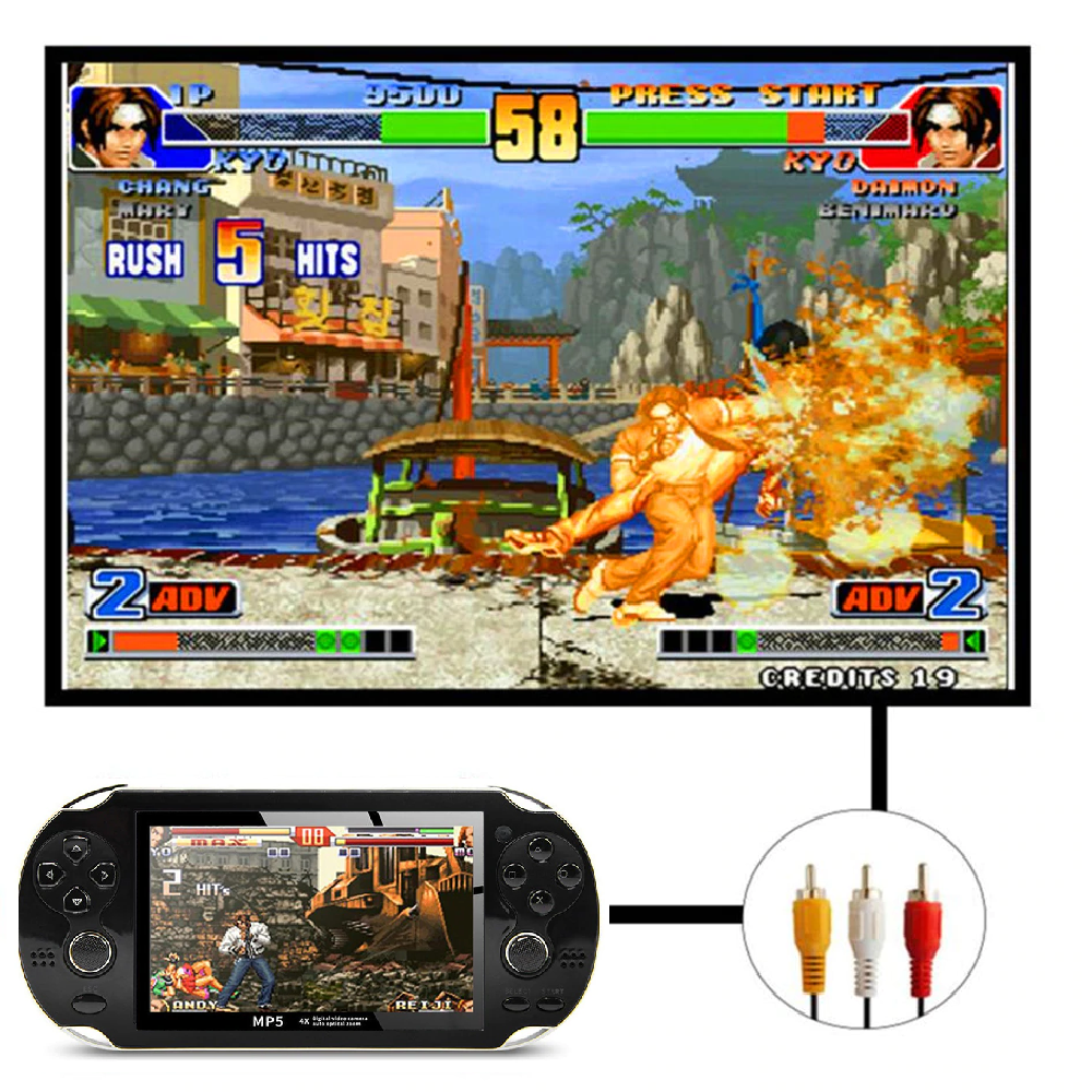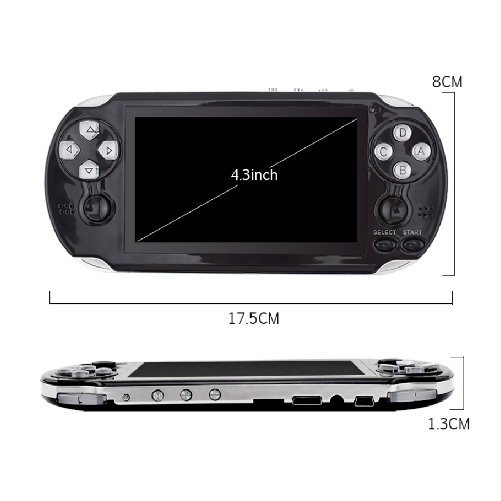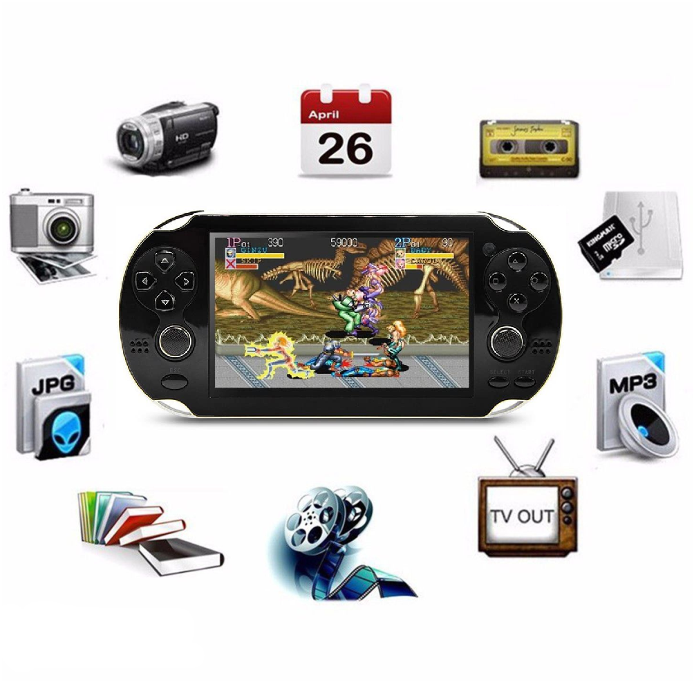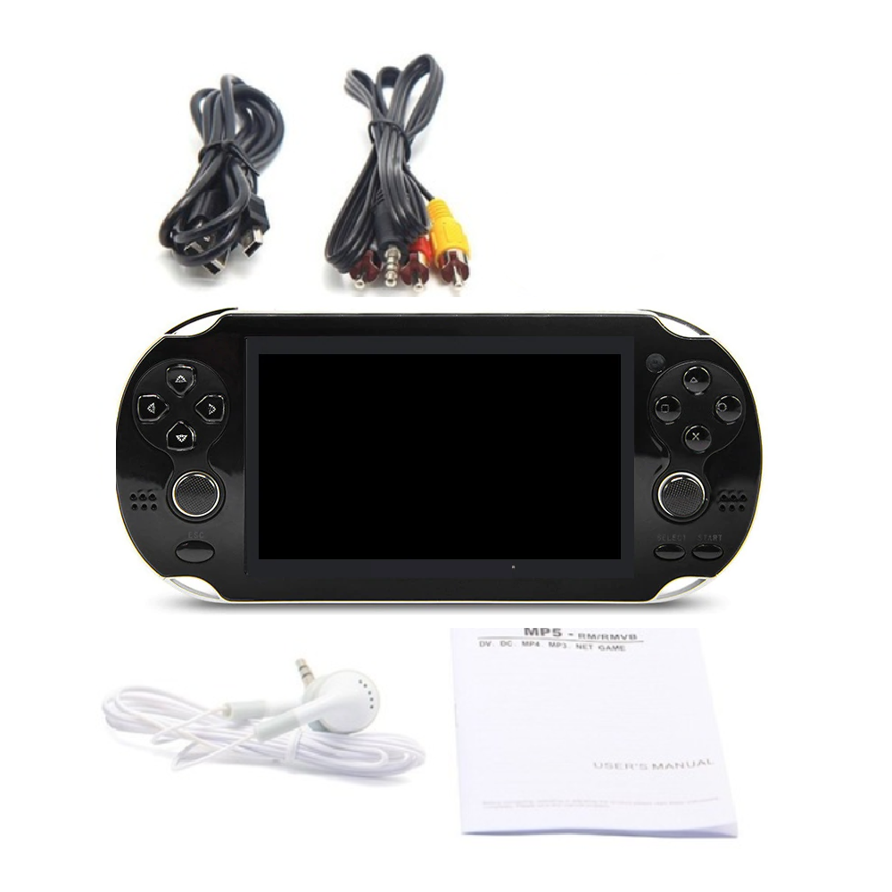 Espectacular consola de video juegos Retro, Recargable con pantalla de 4.3" MP5 MultifuncionalCompatible con Arcade NEOGEO/CPS FC/NES, SFC/SNES/GB/GBC/GBA/SMC/SMD/SEGA.CARACTERÍSTICAS:* Reproductor portátil de 4.3 pulgadas con mas de 300 juegos incorporados y consola de videojuegos portátil* Pantalla WQVGA de 4,3 pulgadas: 1600 k-color verdadero* No hay necesidad de conversión: soporte RMVB, FLV, RM, AVI, DAT, VOB, MOV, 3GP, MP4.* Características del juego: soporte para muchos formatos de juegos.* SALIDA DE TV: conecte con la TV para ver DV y video.* Cámara: No incluye* Memoria interna de 8GB: con capacidad de hasta miles de canciones, juegos y archivos de video.* Expansión de la memoria de la tarjeta TF: aumente la capacidad de la memoria hasta 32 GB con la ranura de expansión TF.* Formatos de música: efectos de sonido MP3 / WMA / FLAC / APE / AAC / WAV / Play FX; Excelente rendimiento de efectos de sonido.* Grabadora de voz: Grabación de voz de larga duración con micrófono incorporado.* Batería: recargable. Se puede usar para jugar durante aproximadamente 1 -2 horas.* Multiple efectos de sonido y modos de repetición para la selección.* Compatible con multitarea: escuchar música y leer libros electrónicos.* Radio FM estéreo: con función de grabación (se puede seleccionar)* E-Book Reader: soporta lectura de formato TXT y marcador* Construido en más de 300 juegos incorporados* Puerto USB 2.0 de alta velocidad: sincronice en segundos con lo último en tecnología de carga USB* Función de disco movible.* Soporta actualización de firmware.ESPECIFICACIONES: * Capacidad de memoria: 8GB interna (Expandible hasta 32GB con tarjeta TF) * Lenguaje OSD: Inglés, Chino* Color: (como muestran las imágenes)* Dimensión: 170 * 80 mm / 6.69 * 3.15 pulgadas (aprox.)LO QUE OBTIENES CON TU COMPRA:1 x Consola de juegos MP51 x Audífonos1 x Cable de carga USB1 x Manual de usuario1 x Cable AV Condiciones para la solicitar la garantía del producto:Ten en cuenta que el producto debe llegar en buen estado físico, sin golpes, rayones, o fisuras, por tanto, te recomendamos empacar muy bien en una caja de cartón, protegiendo con plástico burbuja o papel. En caso de llegar golpeado o dañado por la transportadora no podemos hacernos responsables del producto, tampoco iniciar el proceso de garantía. La garantía sólo cubre defectos de fábrica, no cubre daños ocasionados por el comprador.